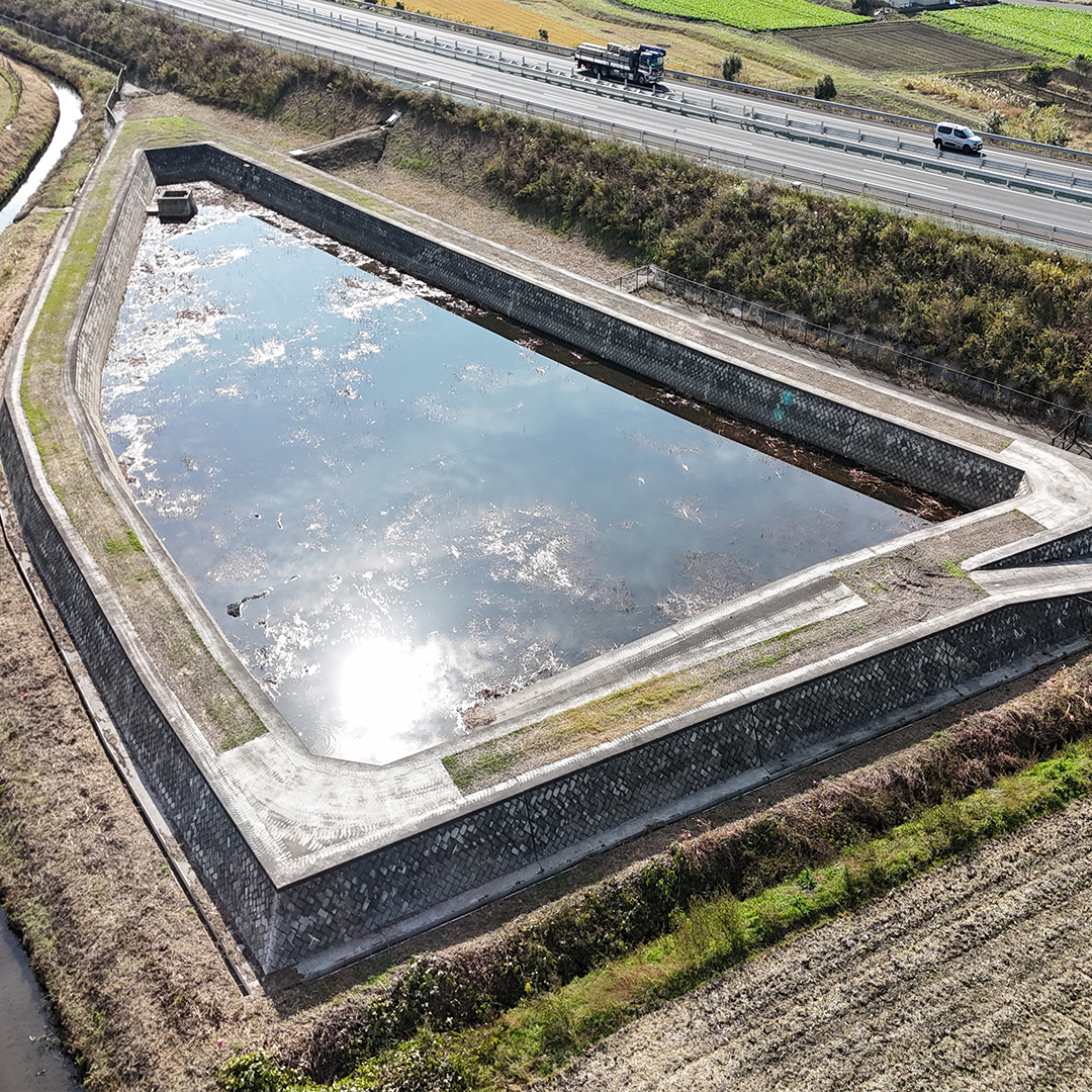 当工事は、圏央道の調整池の排水工事と近辺の舗装工事を行います。