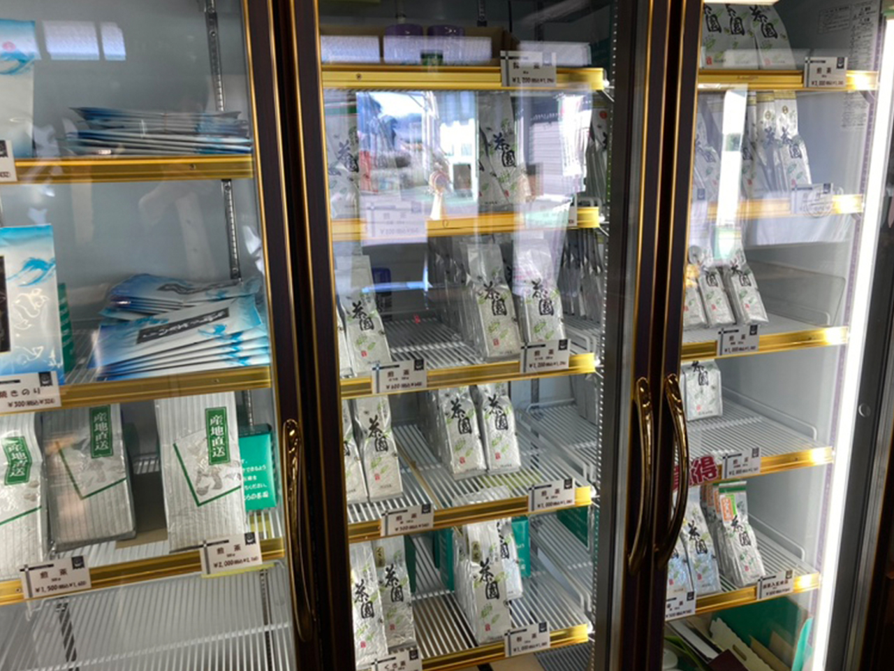 お茶屋さんの暖簾をくぐるとまず大きな冷蔵庫が目に入ってきました。