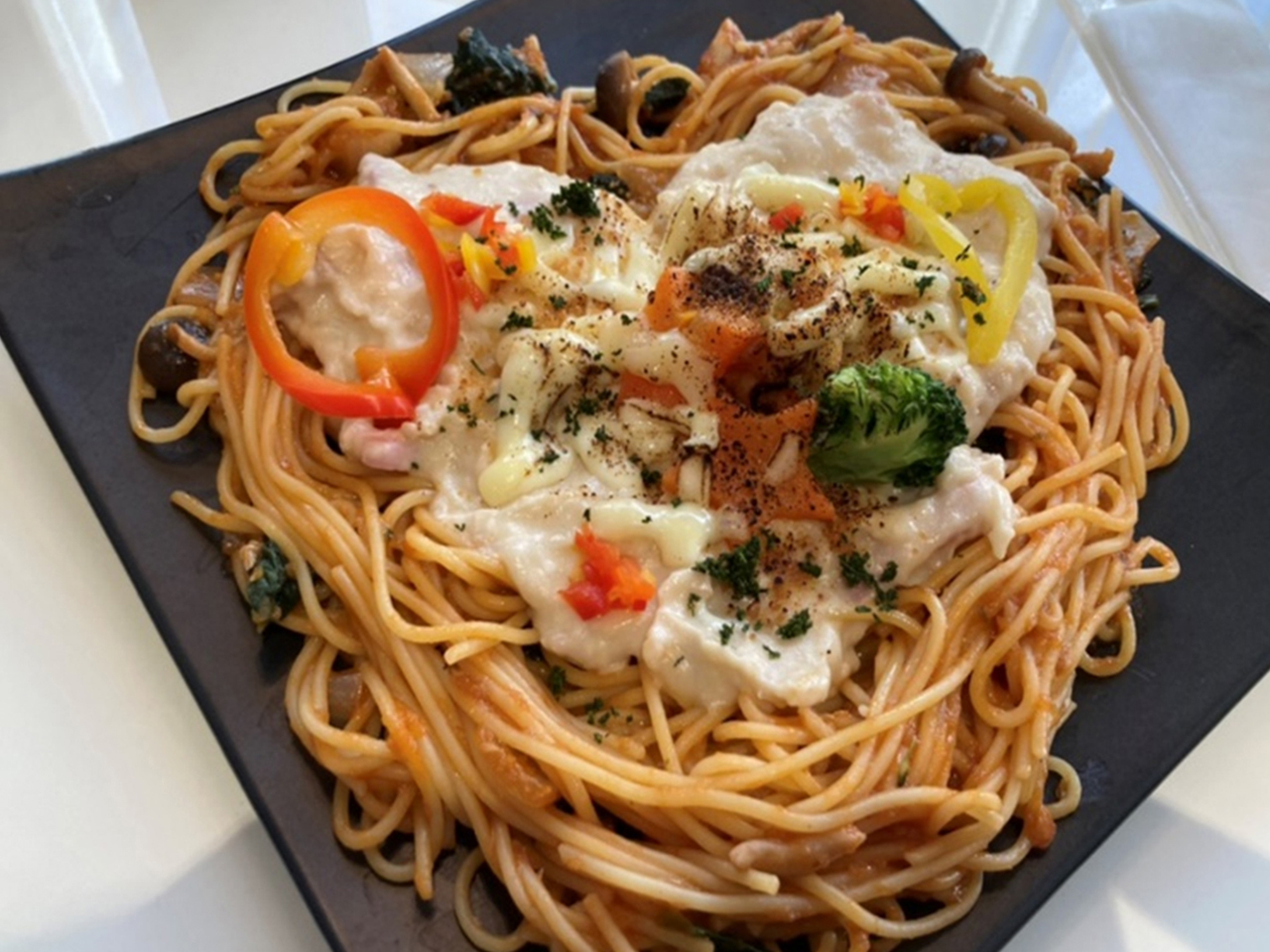 大きなお皿いっぱいにパスタとその上にはグラタン。ハートの形をしていてかわいいですね。