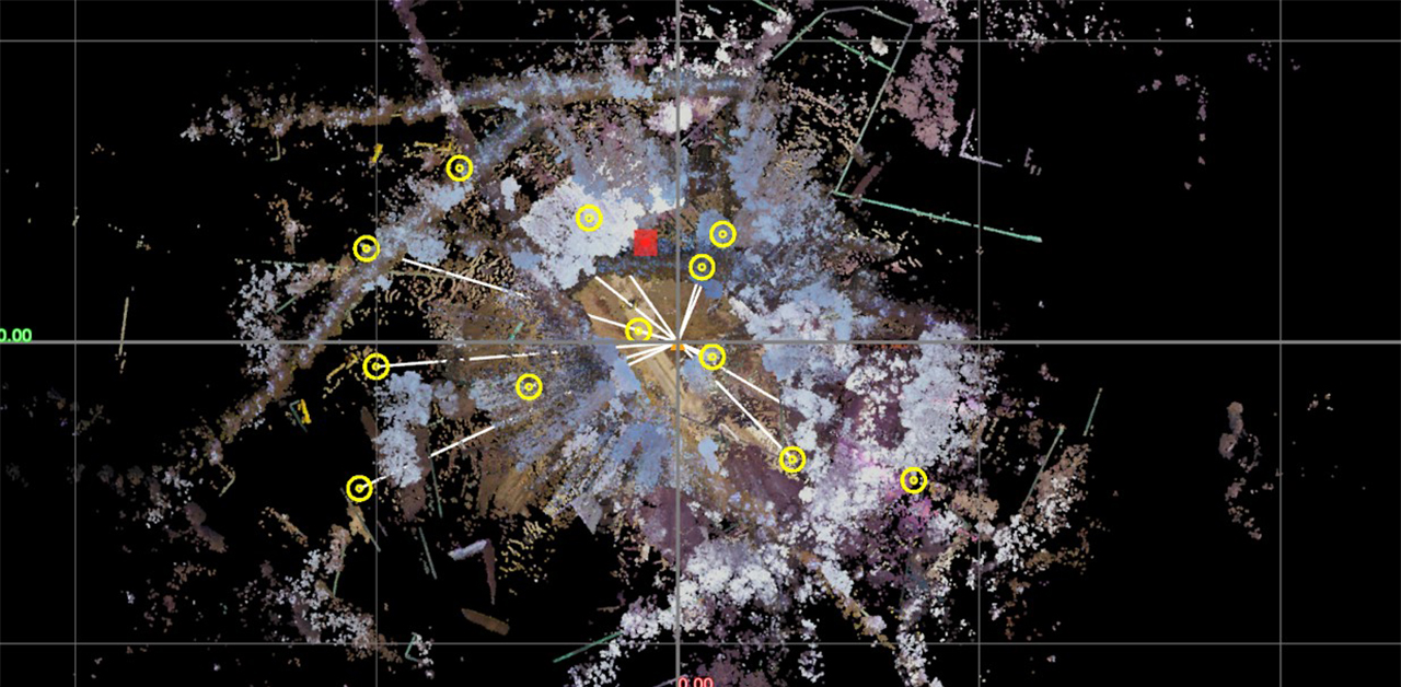土量を測定したい地点にレーザースキャナー(周囲の地形データや物体データを高速で取得する装置)を設置します。