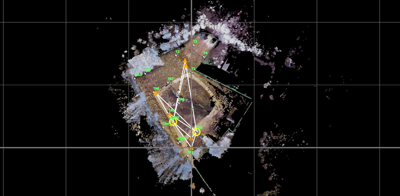複数回スキャンして得た点群データは、パソコンに取り込むと左の画像下の1枚目画像のように、位置合わせが行われていない状態で表示されます。