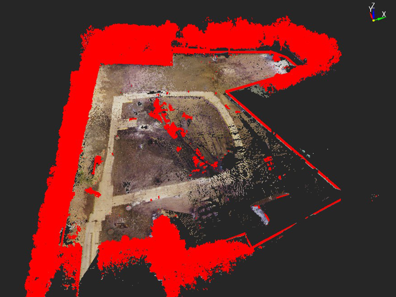 未編集(左の画像)(下の1枚目画像)だと、樹木や重機、車両など、土量などの算出には無駄なデータが含まれているので、該当箇所を選択して削除していきます。