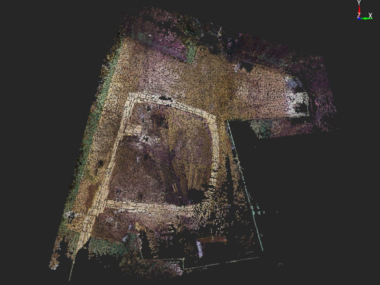 取得されたデータはひとつひとつの点の3次元データの集合体(左の写真)(下の1枚目写真)として生成されます。