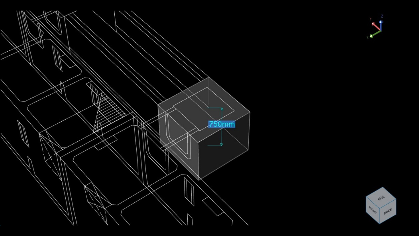 作った面図形を下部へ750㎜延長させ、立体にします。(2枚目)これが押出作業です。