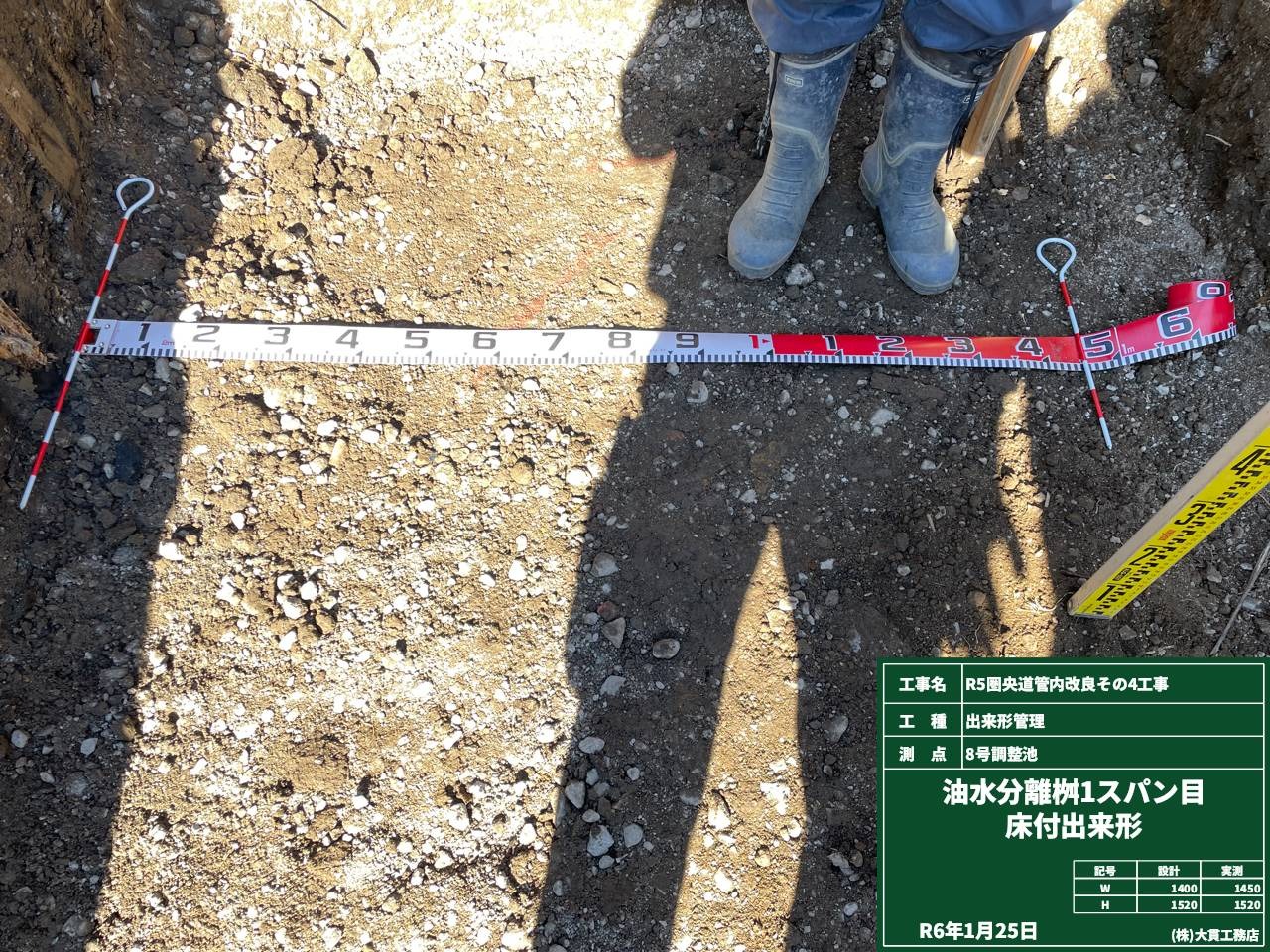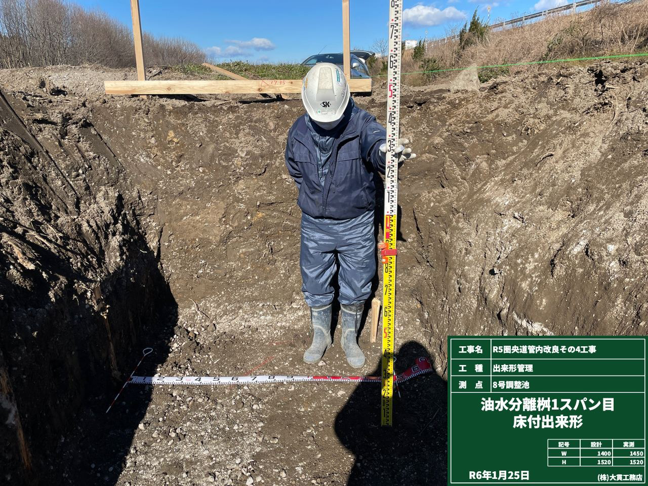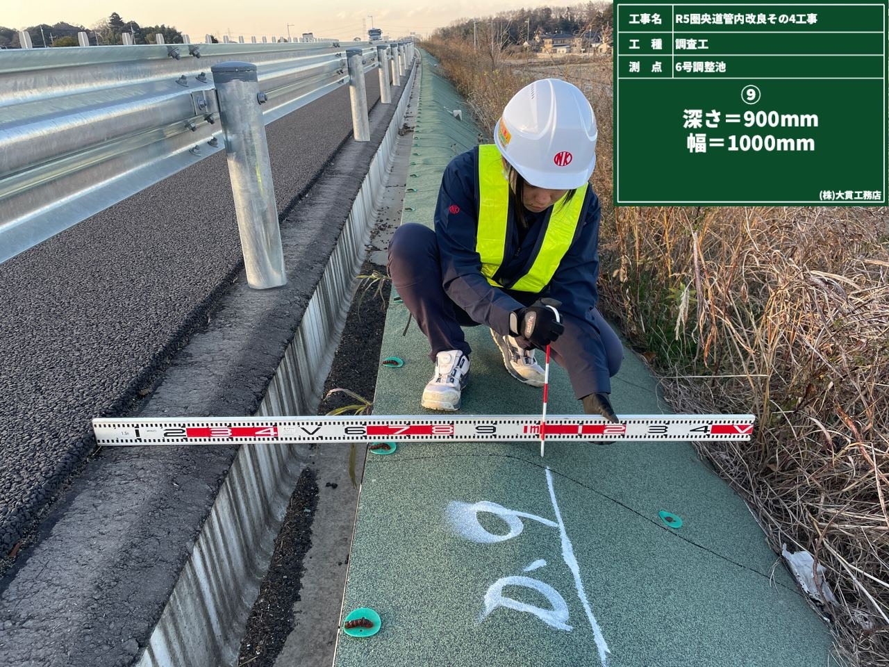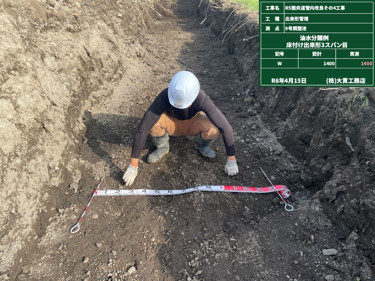 9号調整池も油水分離桝の設置をするので、設置個所を掘削・整正して計画通りになっているか計測します。