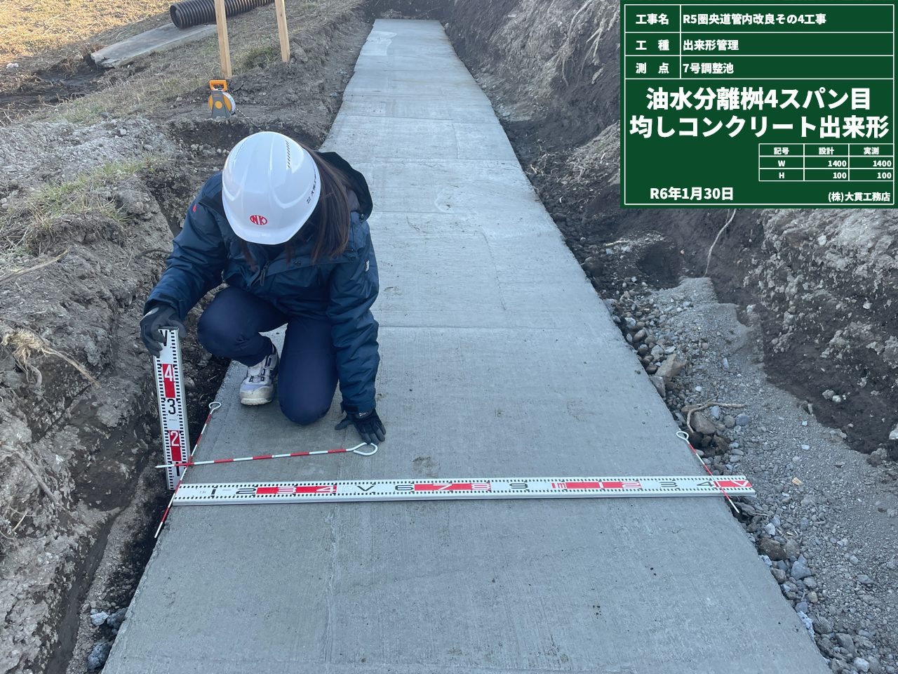 準備が整ったらコンクリートを流し込んで綺麗に均します。基礎が完成しました!(もちろん、打設完了後も計測していますよ!)
