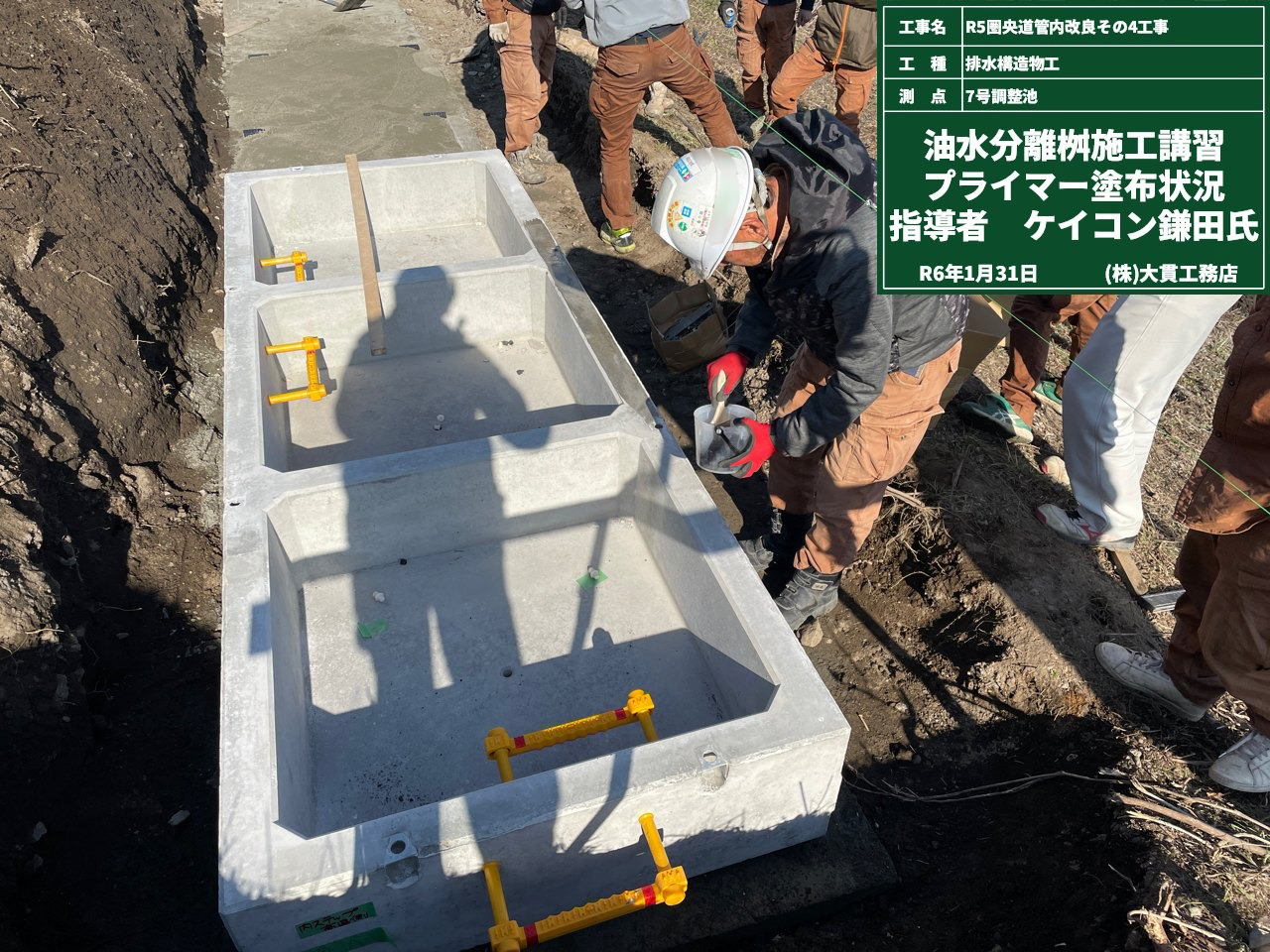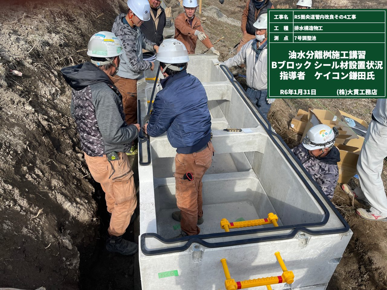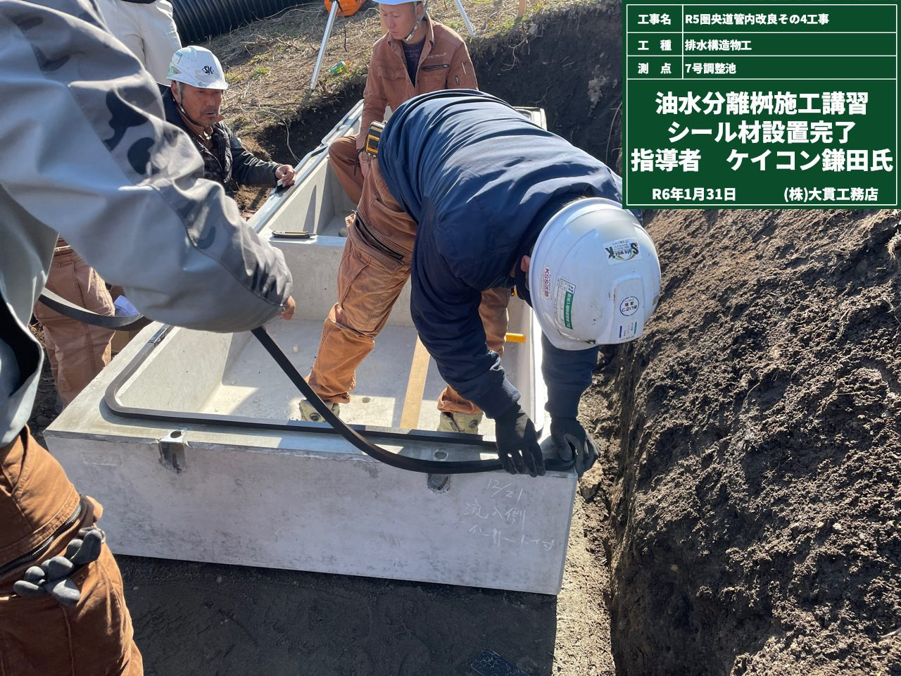 シール材を設置して、プライマーを塗って、ボルトを締めて・・・あっという間に3槽式の油水分離桝設置完了です!
