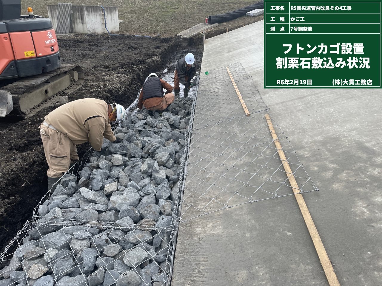 さらに、池底も削られないように、ふとんかご(石の入ったカゴ)を設置します。