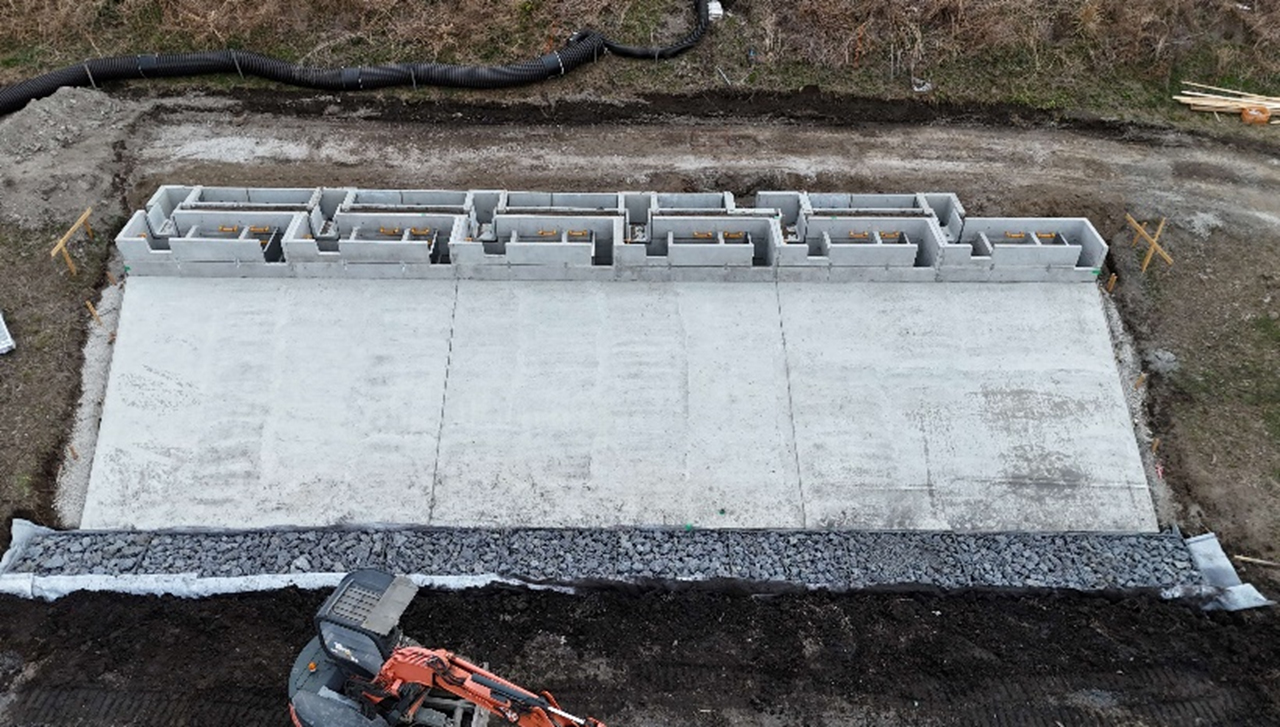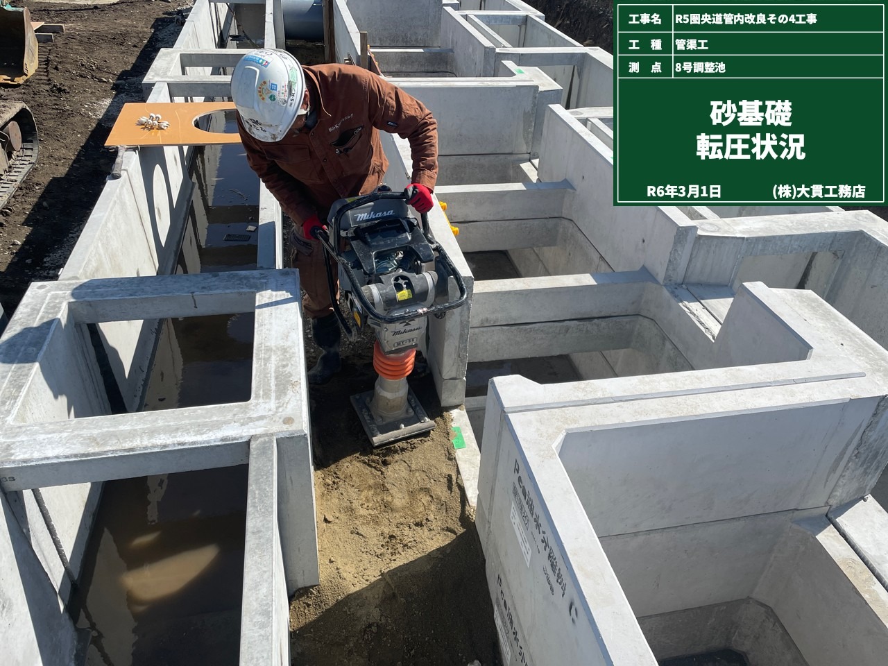 まずは設置する際に、掘削によってかき乱された土に地盤を安定させるために基礎砕石を敷均して転圧します。