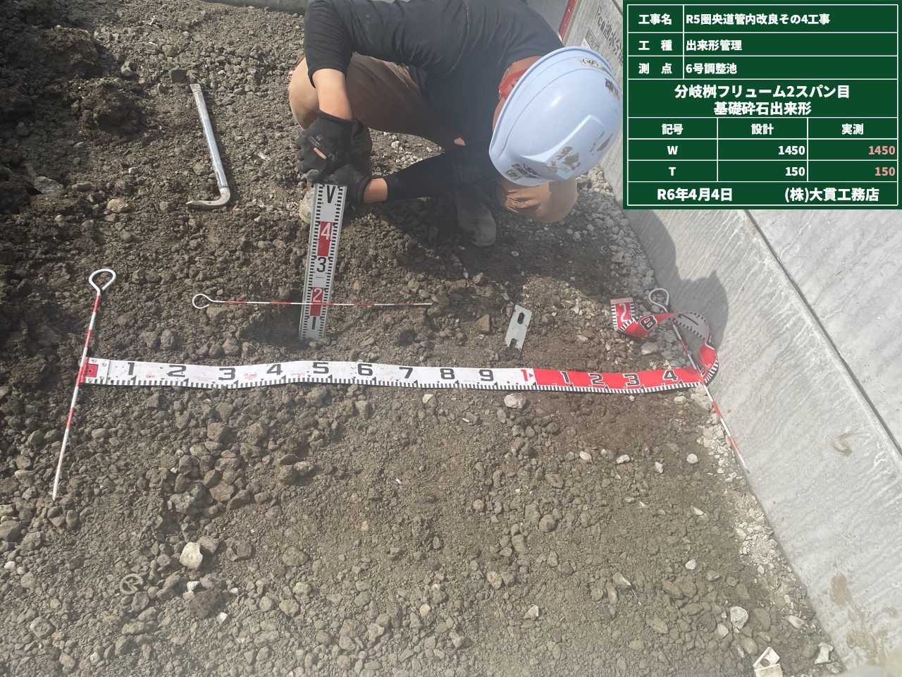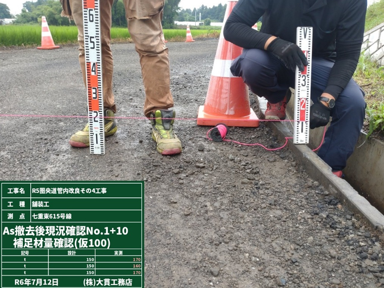 設計高さの路盤を作るには、どのくらい路盤材を追加しなければいけないのか確認しています。
