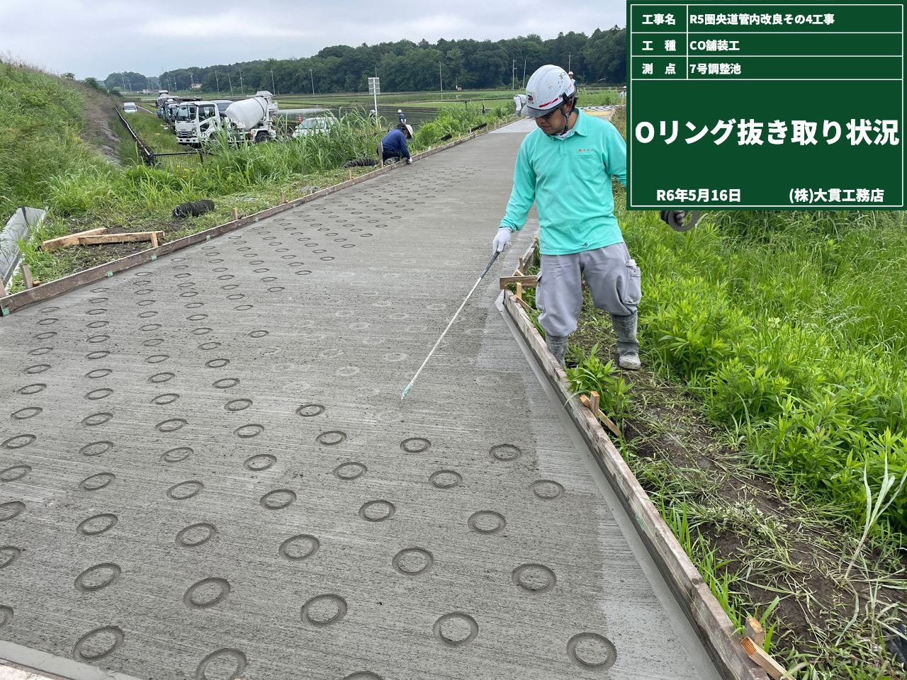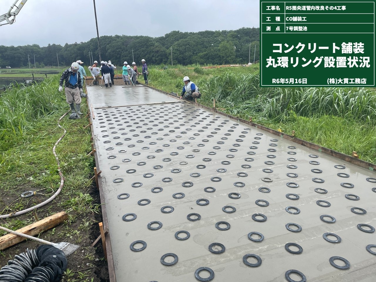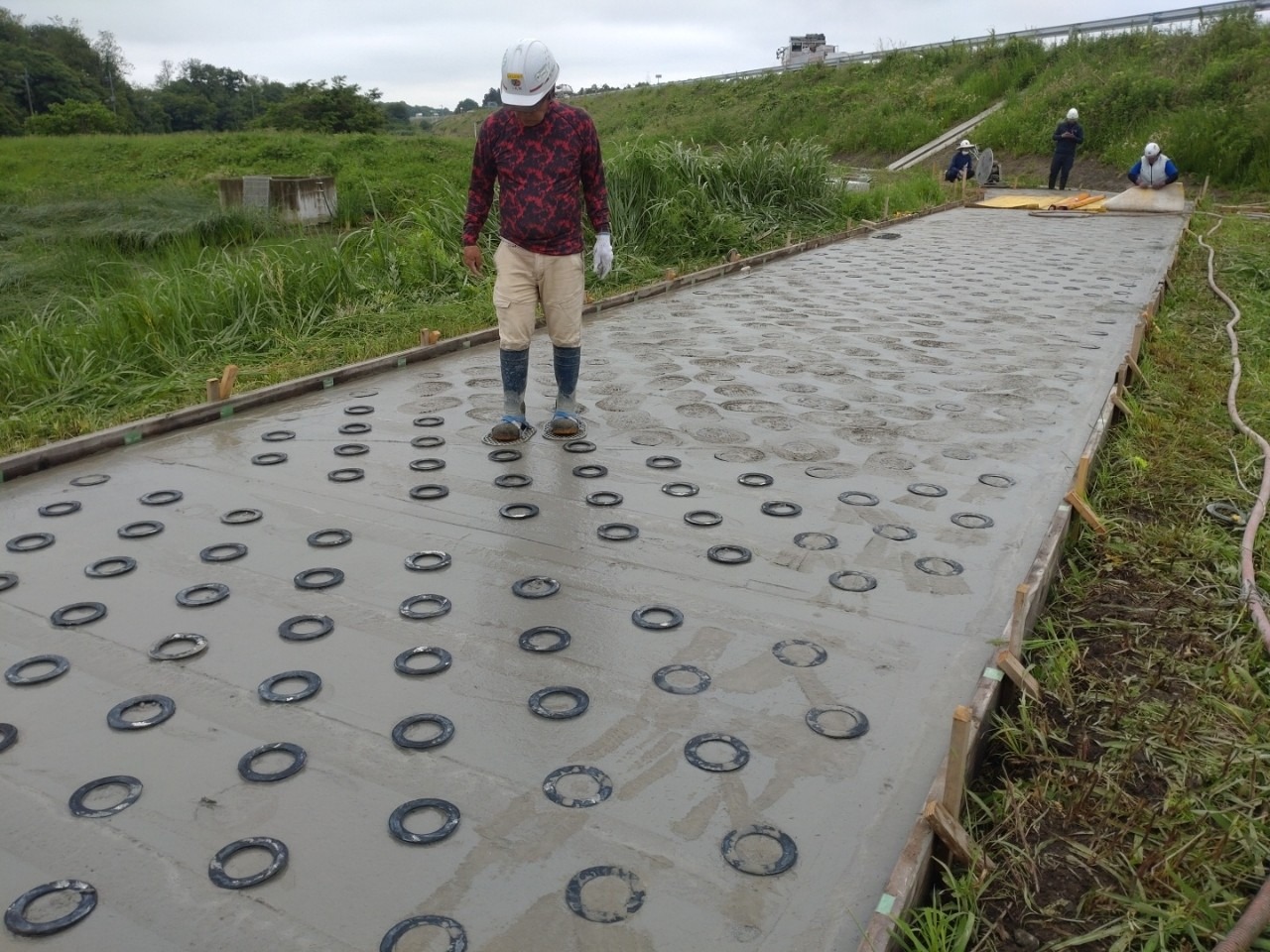 コンクリートを打設した上から、丸環リングをリング定規に合わせて所定の位置に設置していきます。