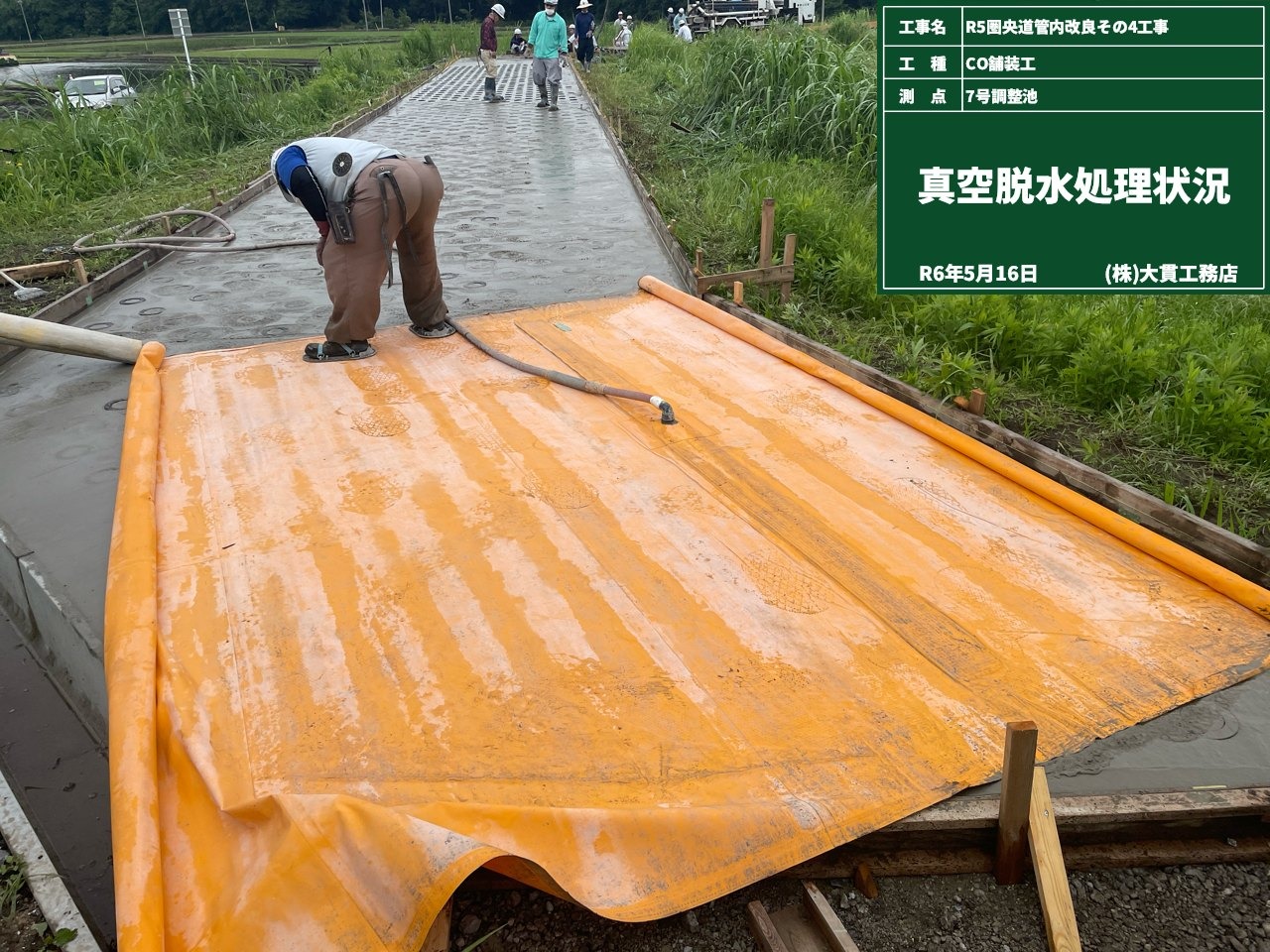 オレンジ色のシートが真空脱水処理用の真空マットです。床表面を真空状態にして専用の真空ポンプで吸引して脱水を行ないます。