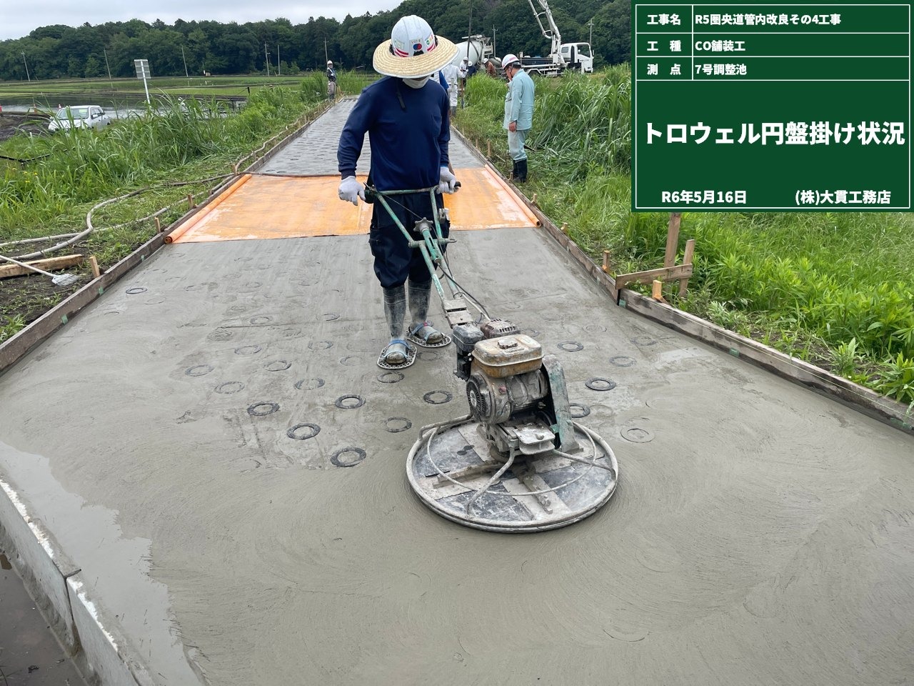 真空脱水処理後、トロウェルという機械を使ってリングとコンクリートの不陸調整をします。