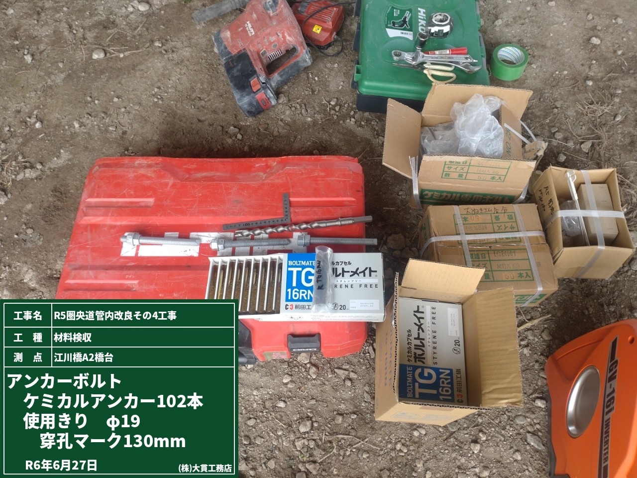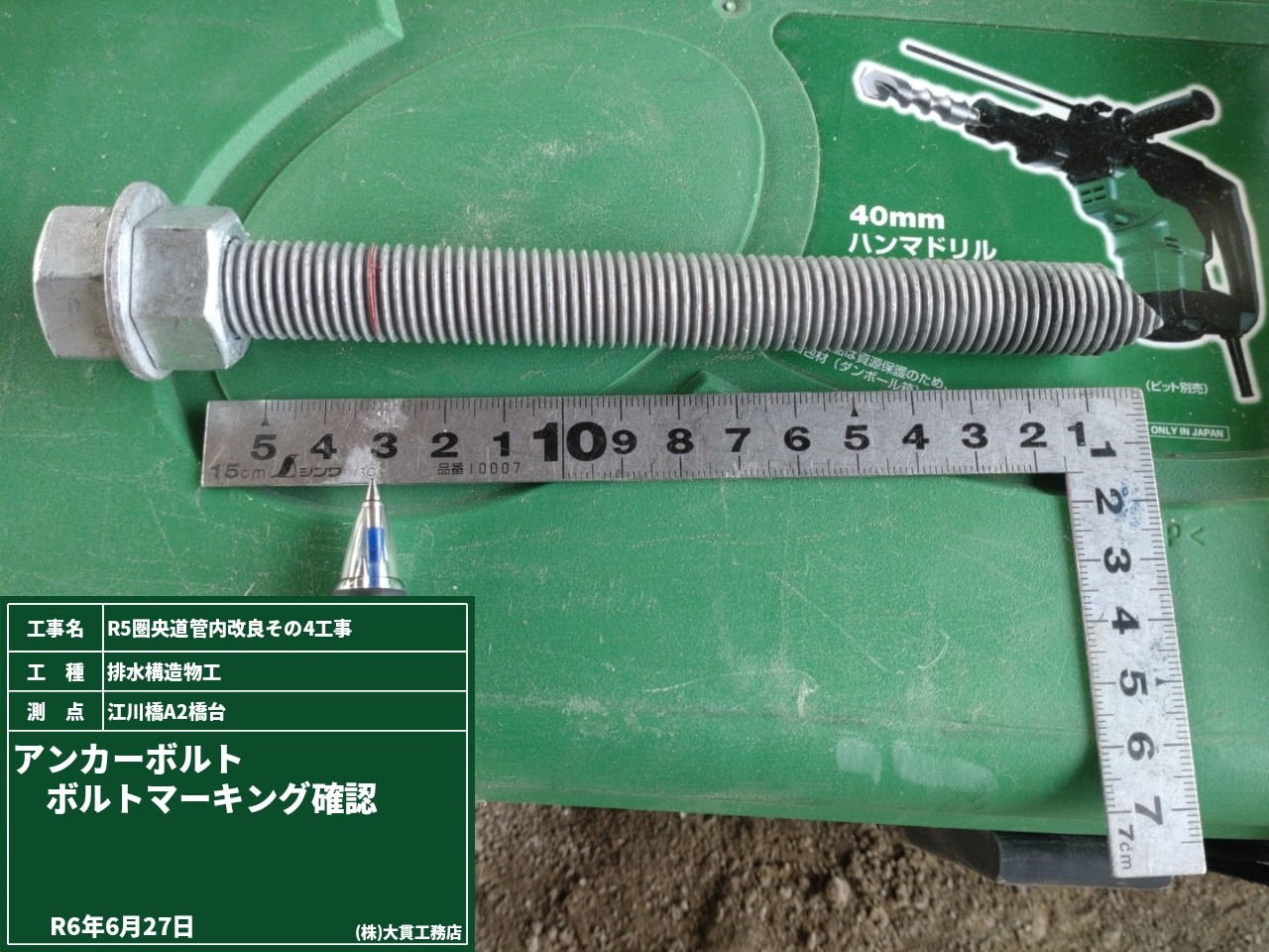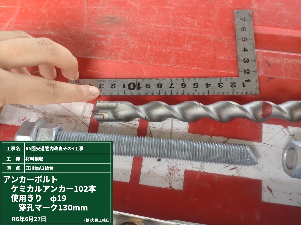 そして2枚目と3枚目の写真は削孔するドリルと打込むアンカーボルトです。穿孔の長さが同じになるようにマーキングをしています。