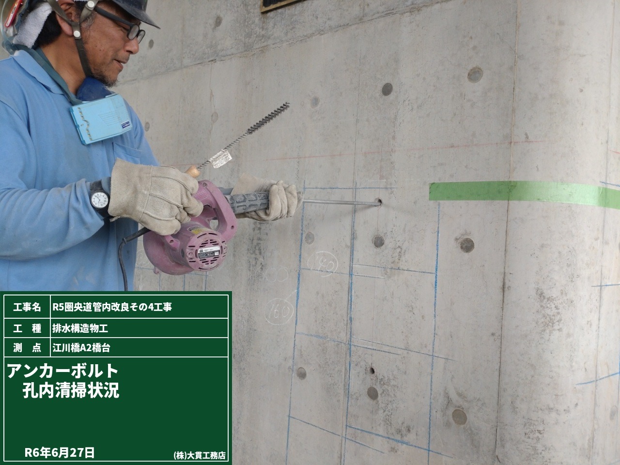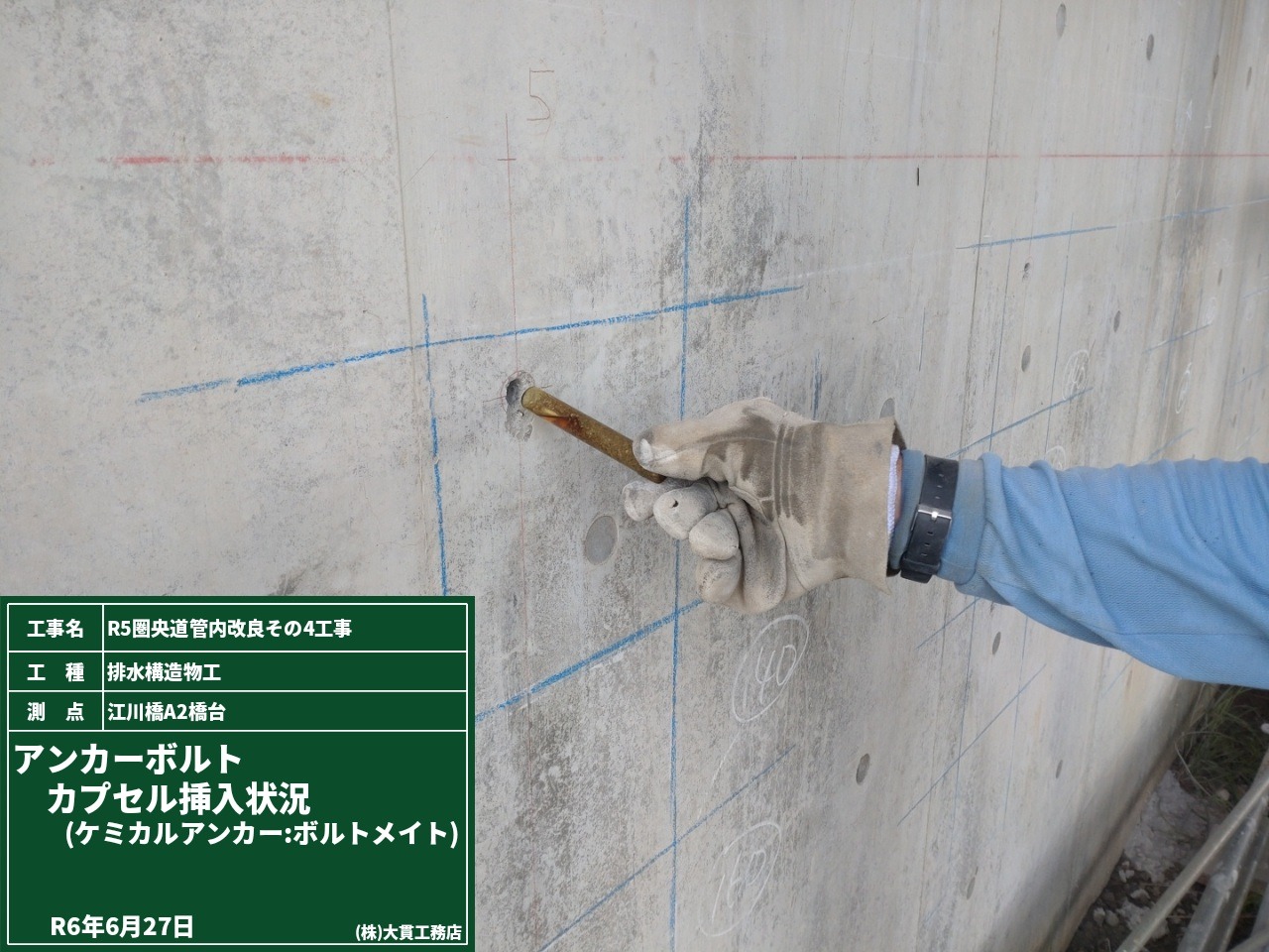 施工方法は、ドリルでコンクリートに穴を開けたら孔内をブロアーやブラシがけで切粉をよく取除きます。そして接着剤と骨材が入ったカプセルを挿入します。