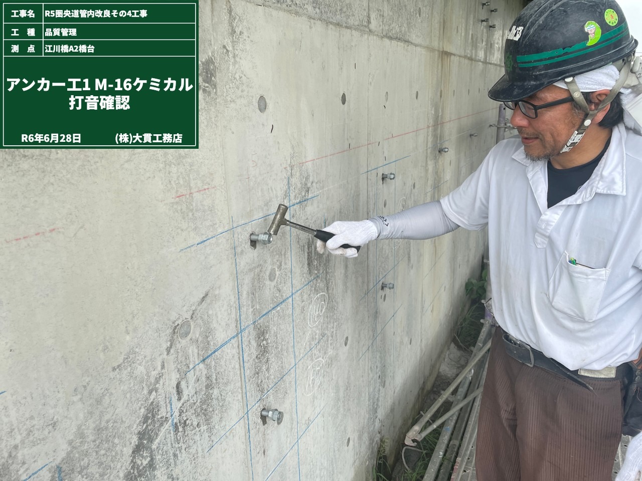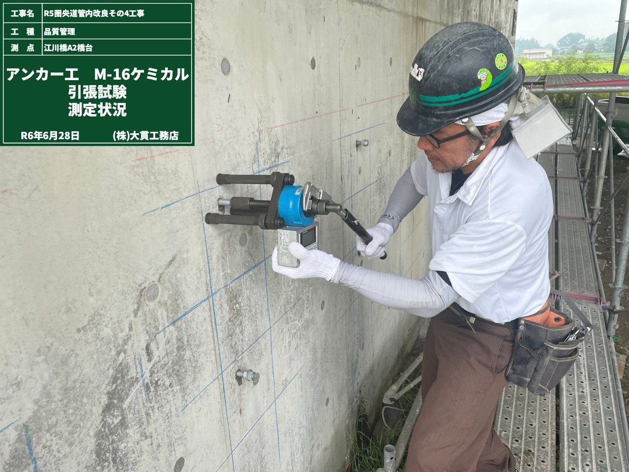 そしてアンカーが固まったら引張強度試験を行います。検査は自主検査(目視・接触・打音等)と立ち合い検査(加力測定装置使用)があります。