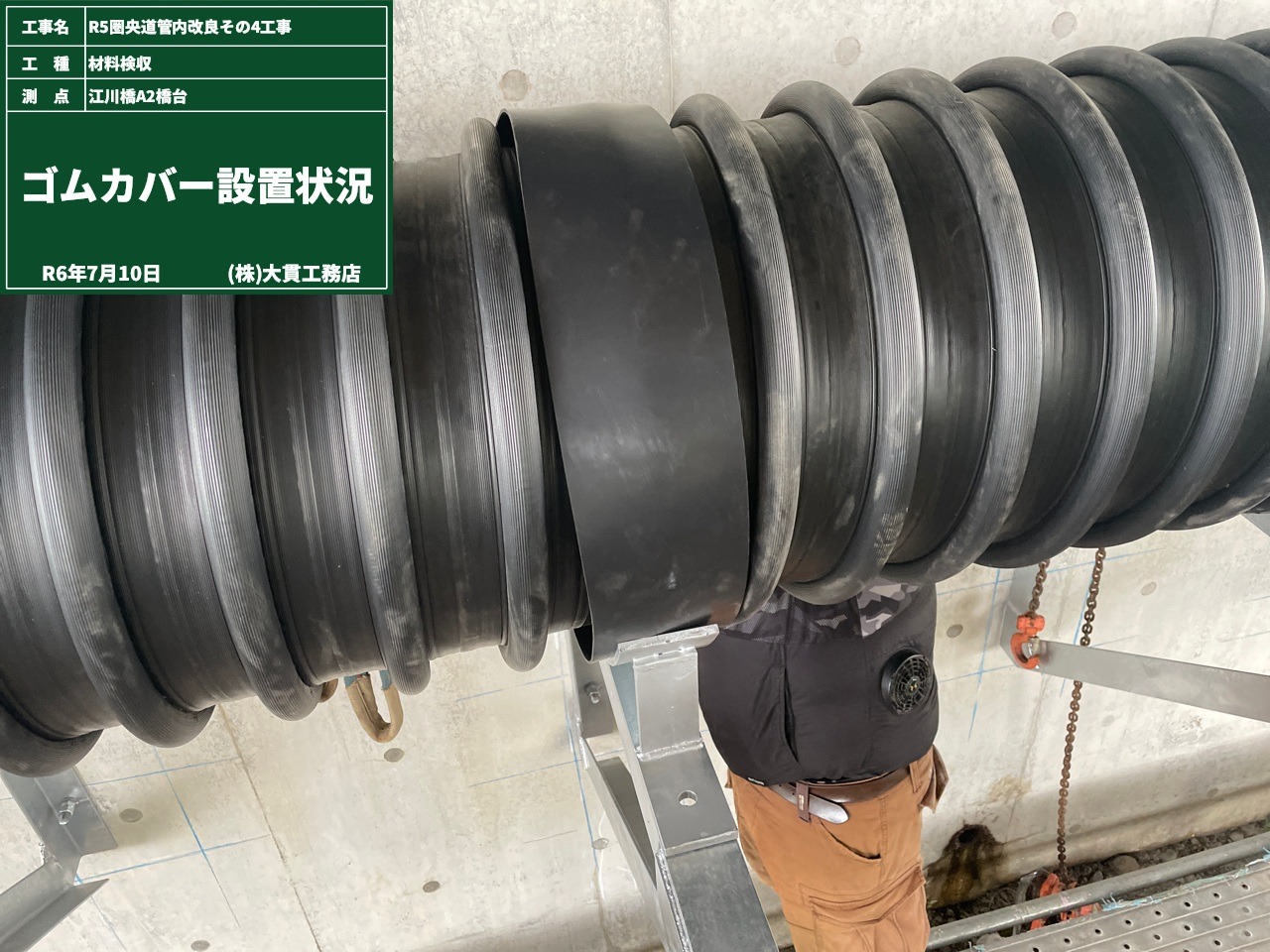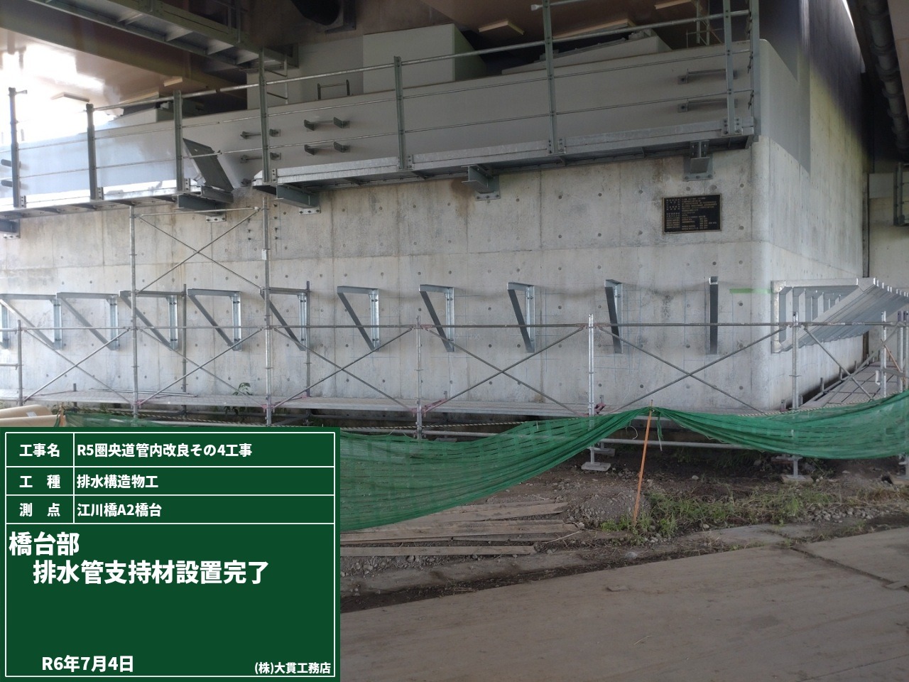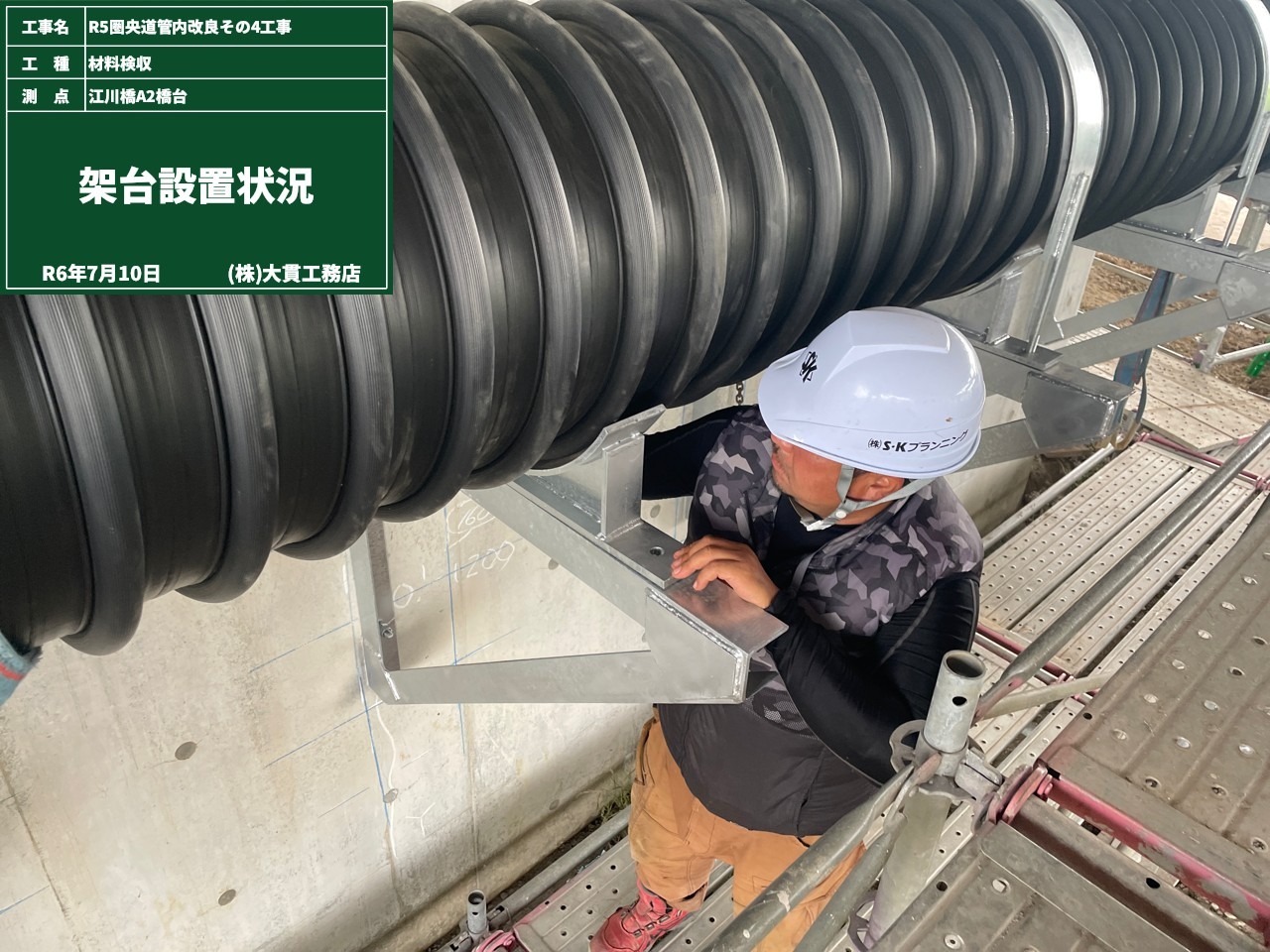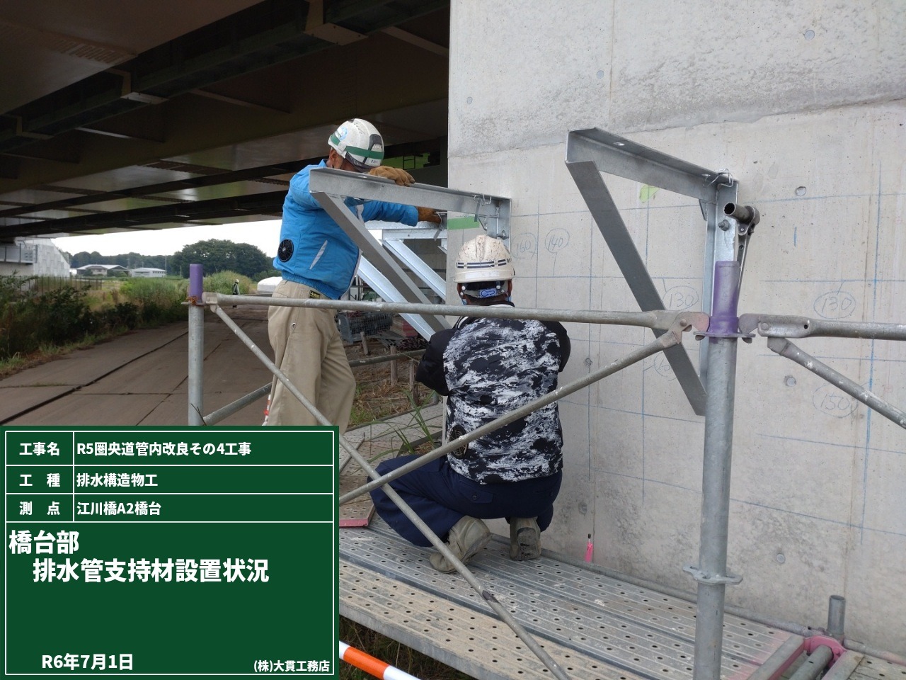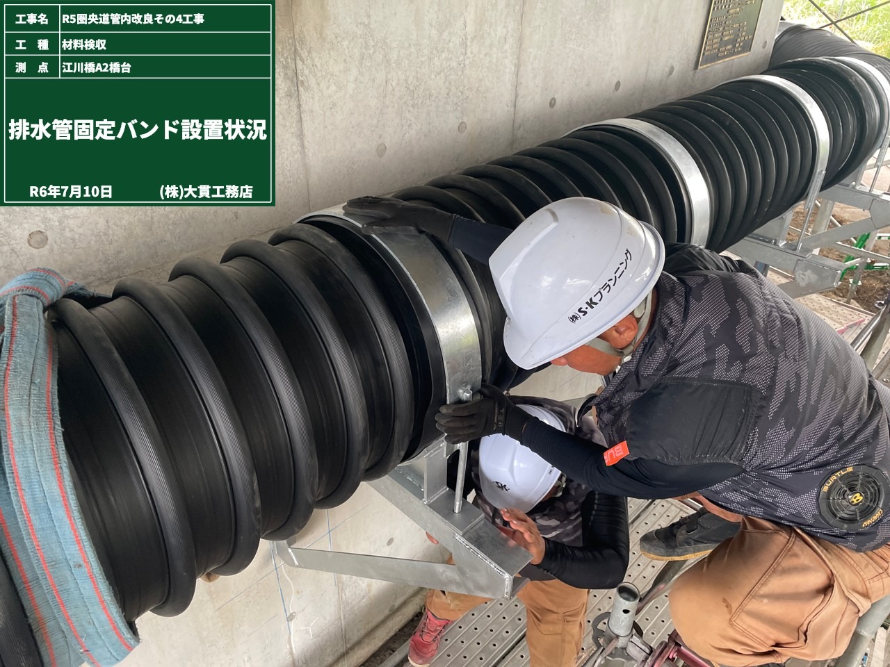 4枚目と5枚目の写真はその検査の様子です。強度に異常がなかったので、排水管支持材を設置していきます。