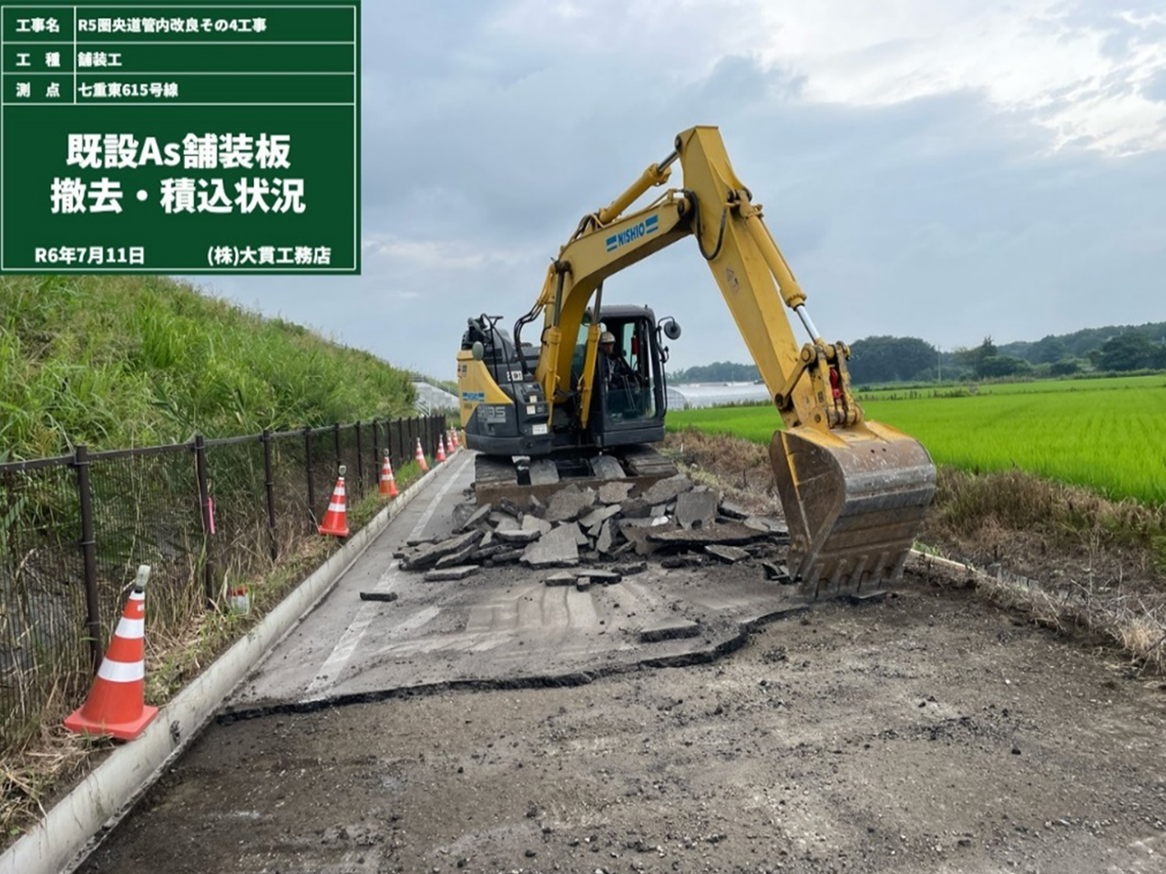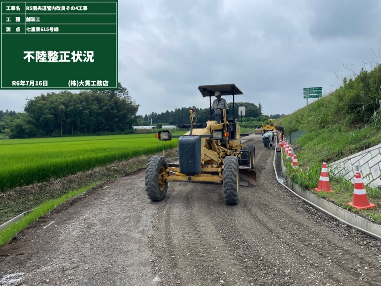 撤去が完了したら、路盤の不陸を実施するため、現況の確認を行います。