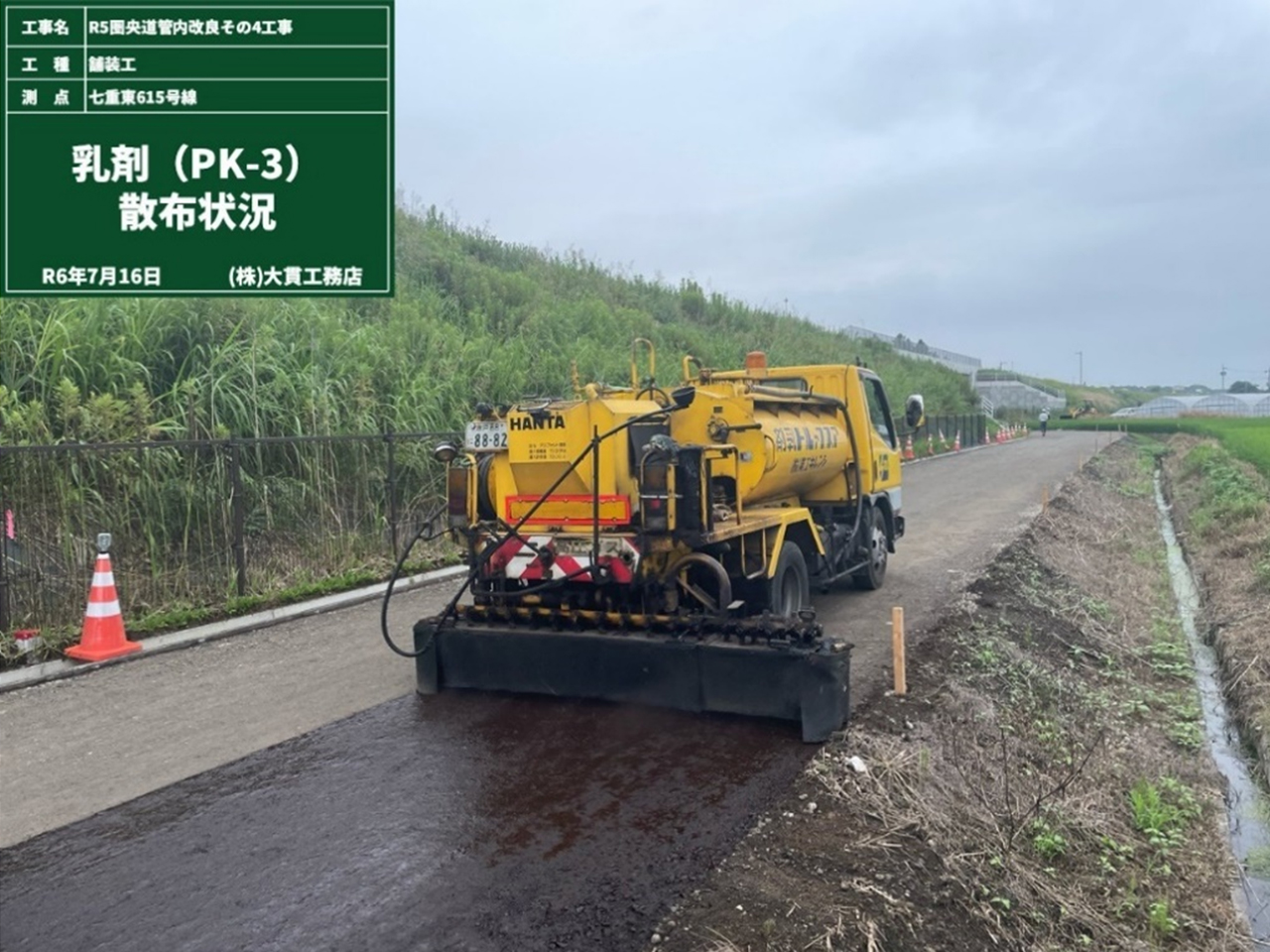 まずは路盤とアスファルトを付着させるための乳酸を散布します。